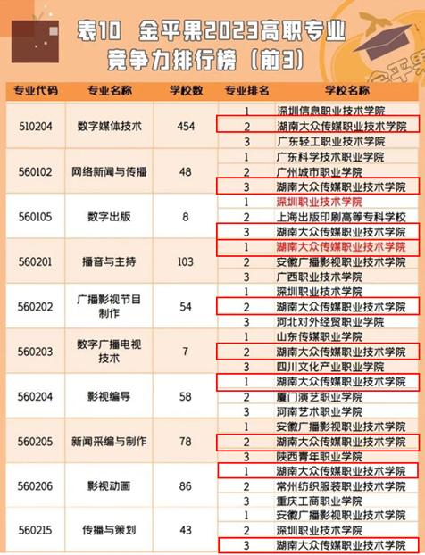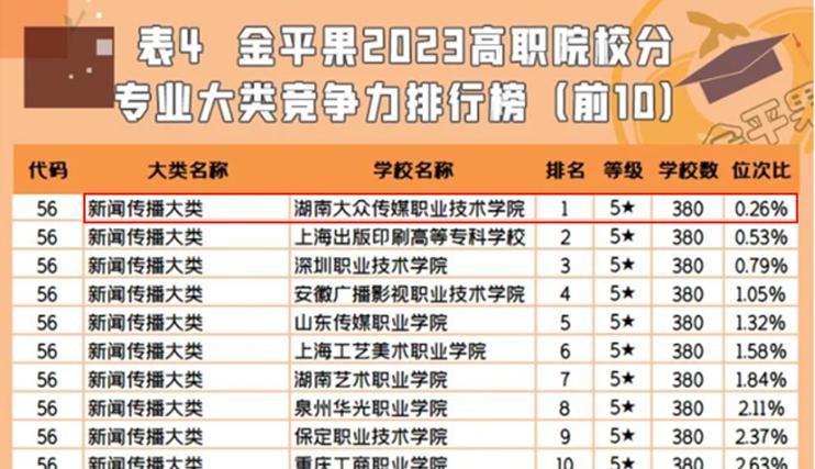 在高职院校分专业大类竞争力排行榜中,我校新闻传播大类位居榜首;在高职院校分专业类竞争力排行榜中,我校广播影视类位居第一名。在高职专业竞争力排行榜中,我校共有10个专业位居排行榜前三名,其中,播音与主持、影视编导、影视动画3个专业位居第一名;数字媒体技术、广播影视节目制作、数字广播电视技术、新闻采编与制作4个专业位居第二名;网络新闻与传播、数字出版、传播与策划3个专业位居第三名。