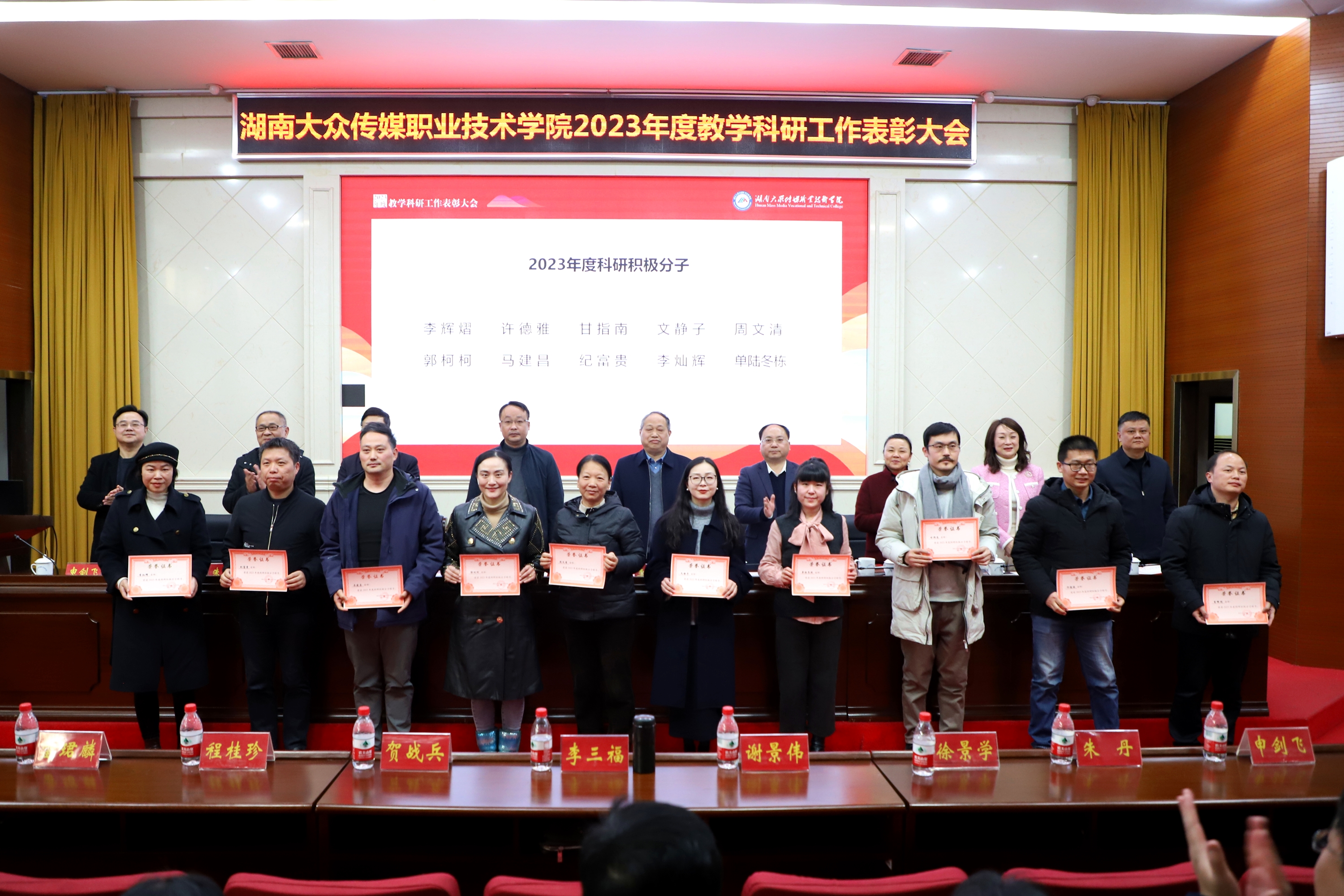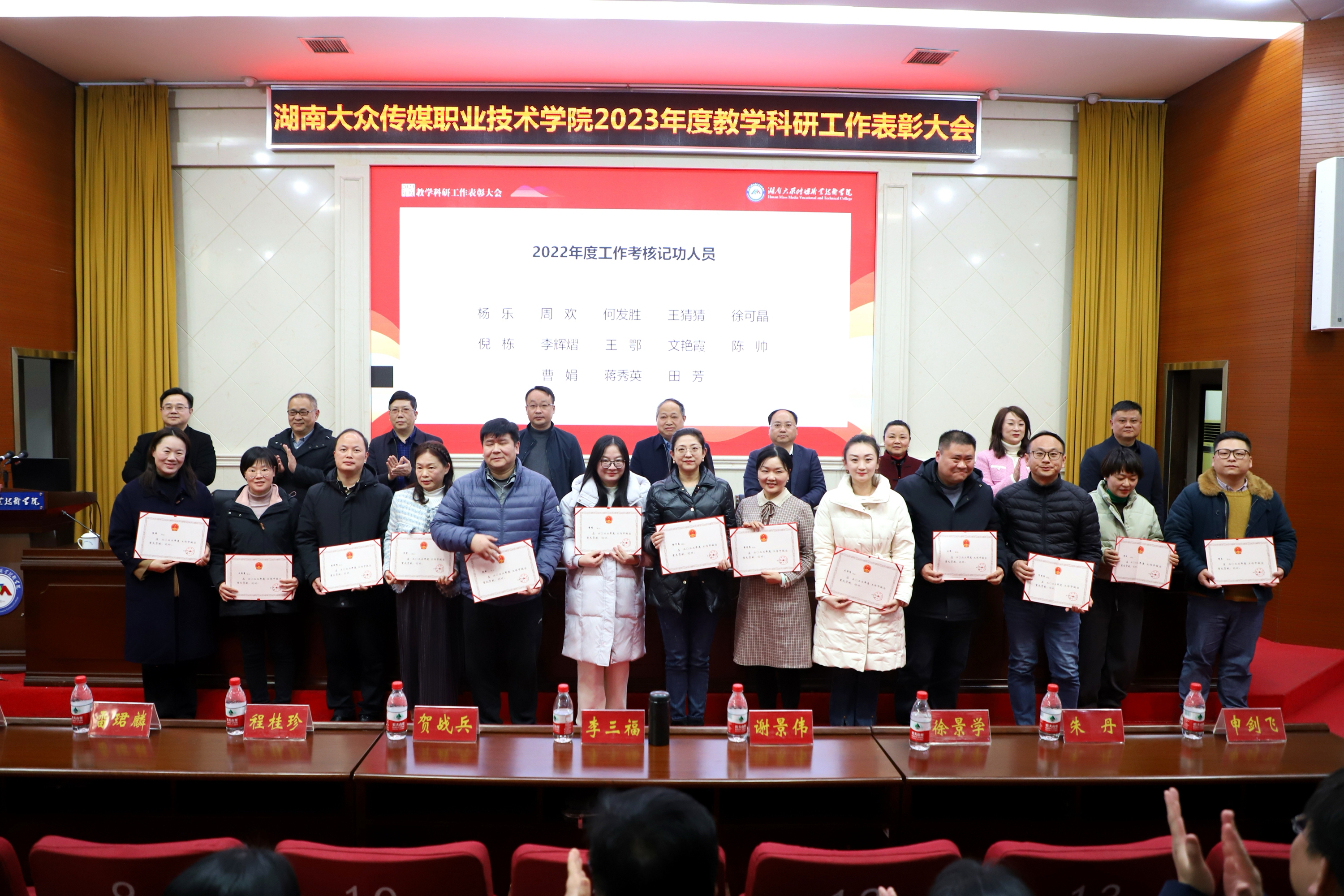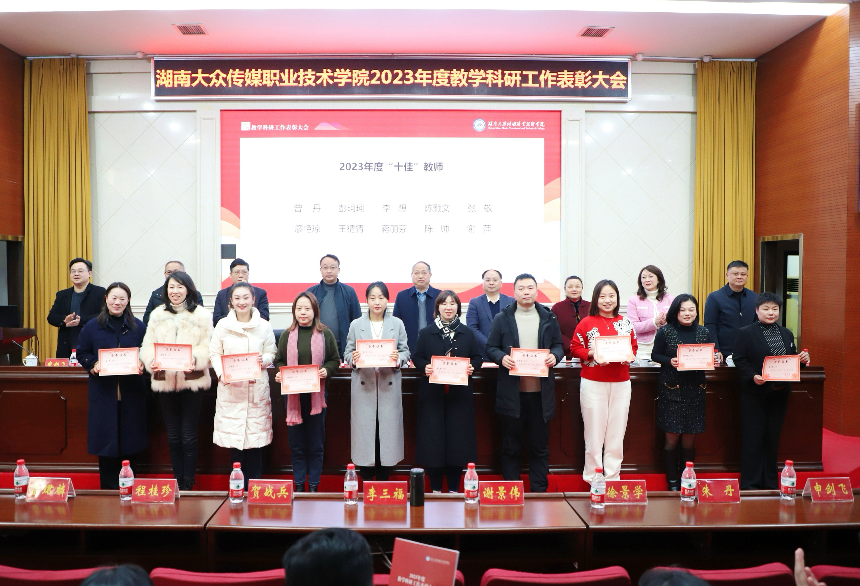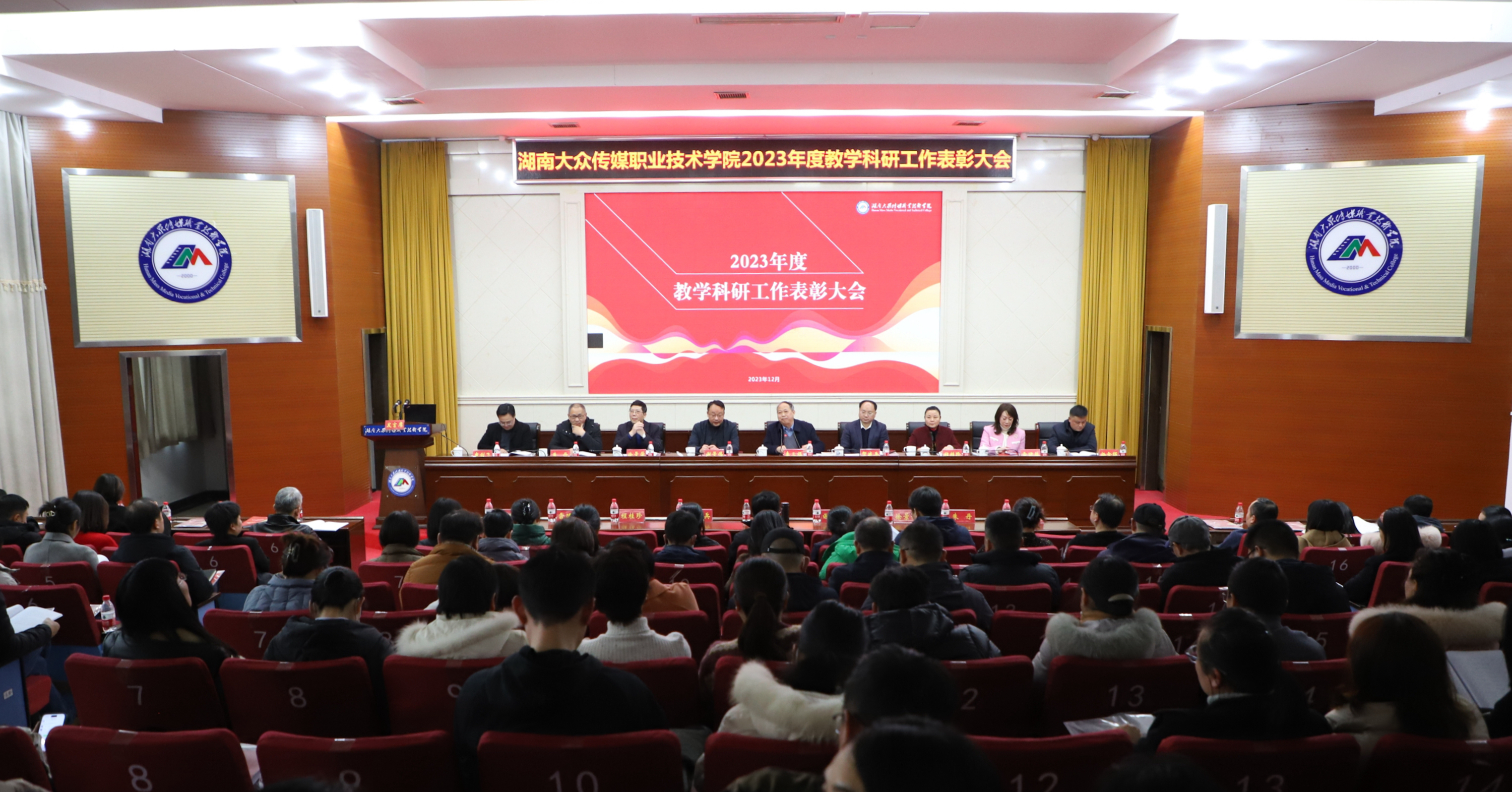 副校长雷珺麟宣读《湖南大众传媒职业技术学院2023年度表彰决定》,对“2023年度‘十佳’教师”10人、“2023年度科研积极分子”10人、“2022年度工作考核记功人员”13人进行现场表彰颁奖。并对7个省级及以上教学团队、6个省级及以上专业教学资源库、4本“十四五”国家规划教材、1门国家级精品在线开放课程、12个职业院校教师教学能力竞赛优秀团队、40名技能竞赛优秀指导教师以及6名湖南省教育科学研究优秀成果奖获得者进行大会表彰。