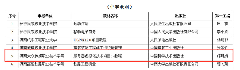 (教务处 易洁 供稿)近日,湖南省教育厅公布了2025年省职业教育优质教材认定结果,我校申报的《大众传媒导论(第四版)》等5种教材成功入选。目前学校共有12种教材入选省级优质教材,这是继学校4种教材入选首批“十四五”职业教育国家规划教材书目后教材建设的又一荣誉。